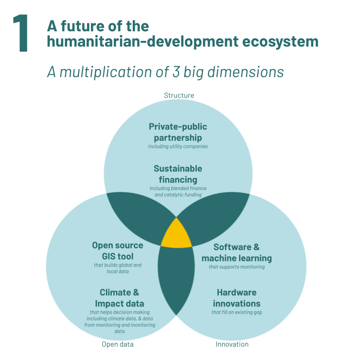 The first one represents 3 even broader concepts - structure, open data, innovations. The area where the 3 “worlds” overlap, is the moment with the most concerted effort and most impactful effect on the humanitarian-development sector's future.